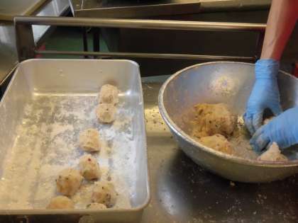 ☆今日の給食は「たこあげ」です。たこあげは、大阪発祥の「たこ焼き」に似せて作料理です。給食室では、1つずつ手作業で丸めて形を作り、油で揚げました。上からソースと青のりをかけて完成です。
