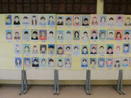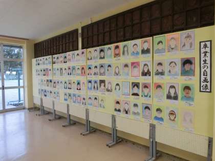 6年生が卒業制作で描いた自画像が、第三昇降口に掲示されました。