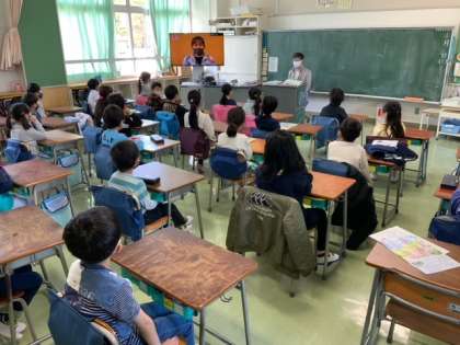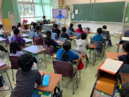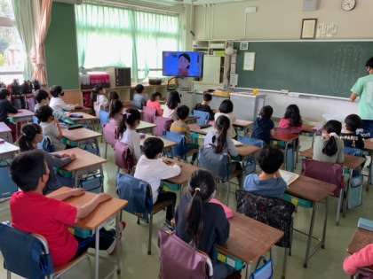全校朝会は、放送で行います。子どもたちは、朝の支度をさっと済ませて、着席をしてお話しを聞きます。生活目標の「相手の目を見て、あいさつしよう。」を心がけましょう。