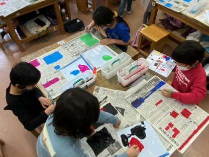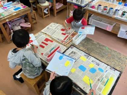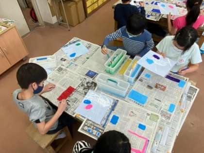 図工では、新聞紙の台紙にたくさんの四角を探して好きな色を塗っています。
