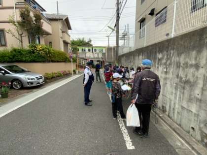 上祖師谷郷土研究会のお二人と駐在所のお巡りさんに交通安全を守っていただきながら、古地名めぐりをしています。黒橋の柱は烏山小学校のタイムカプセルの役割があることや、京王電鉄は大正開通であること、烏山小学校のある場所は一面田んぼであったことなどたくさん教わっています。