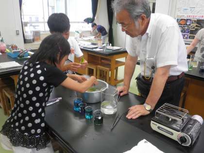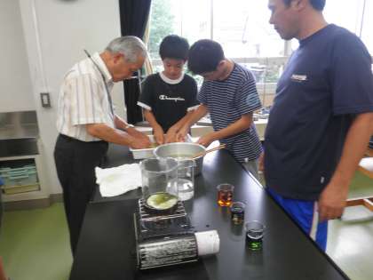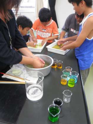 理科実験教室では、葉っぱの葉脈を取る実験をしていました。
