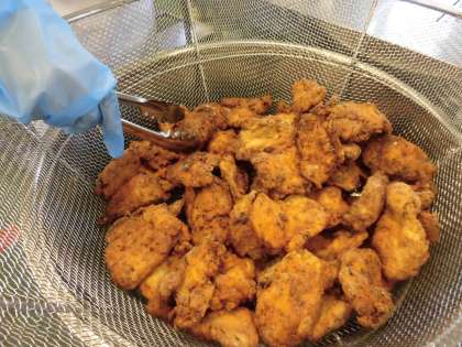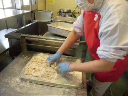☆今日の鶏肉の唐揚げは、給食室で下味をつけ、1枚1枚に粉をつけて給食室の大釜で揚げました。全校分なので600枚以上の鶏肉を調理員さん達が揚げてます。