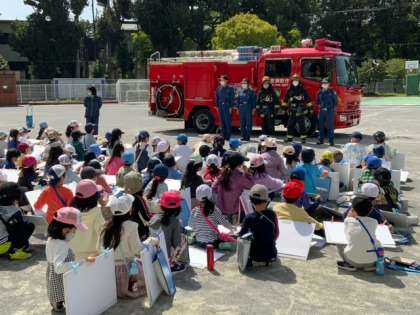 とてもよい天気です。校庭に消防車がやってきました。これから実物をよくみて描きます。