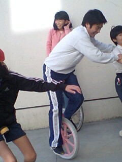 烏山小には、子どもたちが自由に遊べる一輪車があります。中休みや昼休みには、いろいろな学年の子どもたちが乗って遊んでいます。2人組で手を繋いで回ったり、長い距離を走ったりと、楽しんでいるようです。今日の中休みには6年の担任(体育主任)も混じっていましたが・・・体育館の壁から手を離した瞬間・・・。子どもたちに慰められていました。