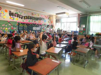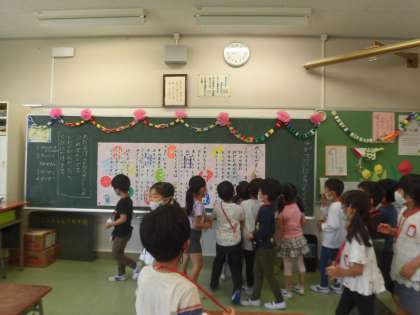 教室に戻ると先ほどまではなかった校歌の紙が教室に貼ってあり、またまた大喜びの1年生。