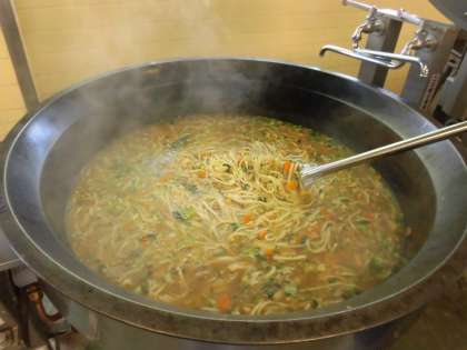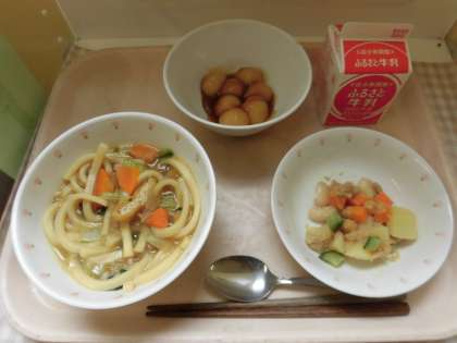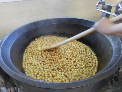 ☆今日は、子ども達の大好きな「みたらしだんご」です。給食室の大釜で白玉を茹でて、みたらし餡をからめました。しょうゆ さとう 片栗粉を入れて、みたらしのタレを作っています。