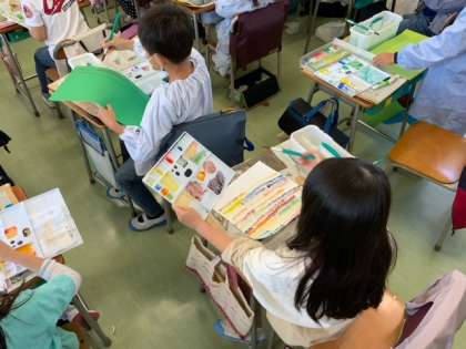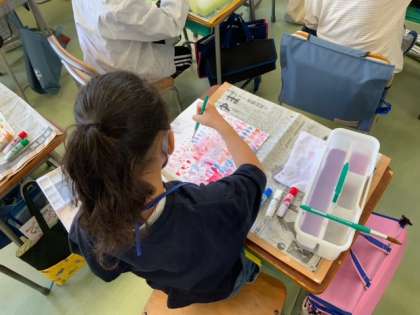 図工で変わったとうもろこしの絵を描いています。さまざまな色を使ったとうもろこしが描かれています。