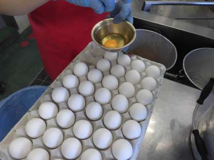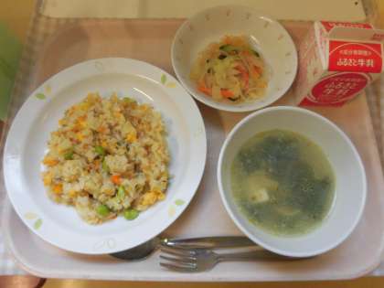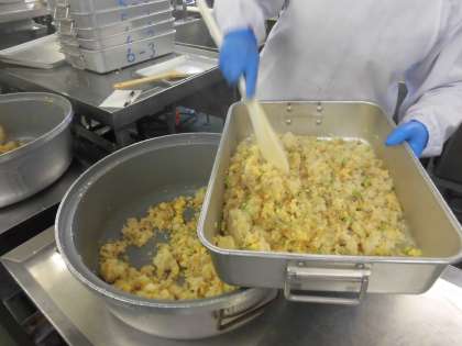 ☆今日は子ども達の好きな「チャーハン」です。給食室でたくさんの卵を割って、炒り卵を作りました。チャーハンの中に炒り卵を混ぜて完成です。彩りに枝豆も加えました。