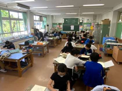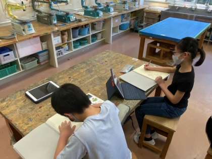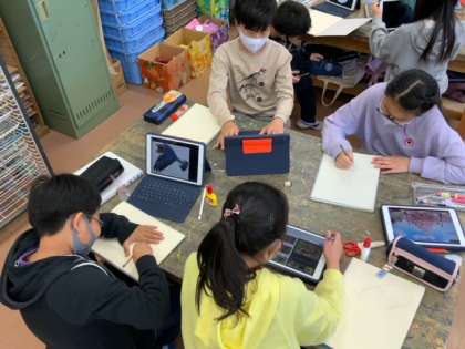 図工では、メタリックアートにする素材をタブレットで調べたり図鑑で調べたりして下絵を描いています。