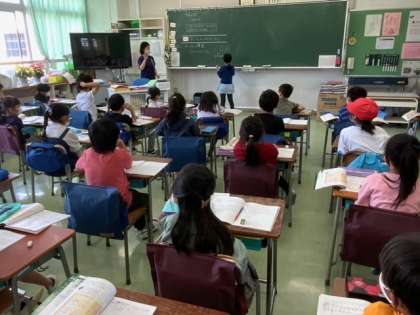 算数の授業で、10のまとまりと1のばらを分けて計算する考え方を使って、筆算の仕方を学んでいます。