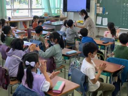 音楽でリズム打ちの後に、茶摘みの曲に合わせて手遊びを接触を避けて楽しんでいます。