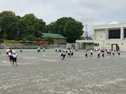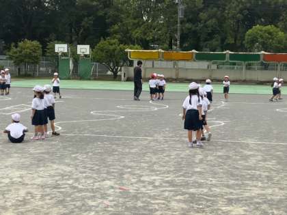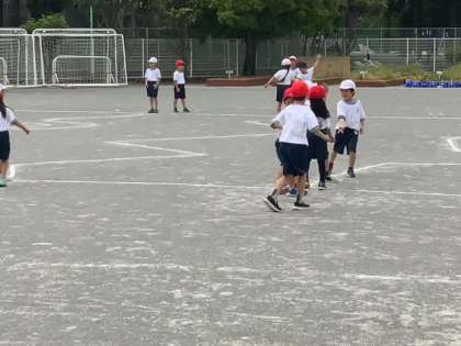 校庭での1年生の合同体育です。ドンジャンケンに楽しく取り組んでいます。