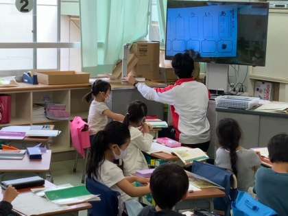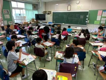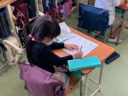国語で頭に「あ、い、う、え、お」のつく言葉を考えて書いています。見つけたら絵もかきます。