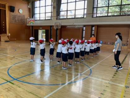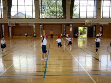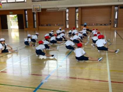 体育館での体育です。整列がしっかりできています。体操の隊形に広がり、準備運動をしたのち、バナナ鬼をしています。