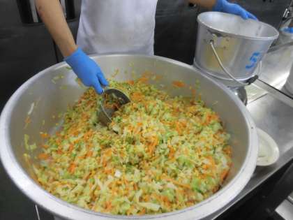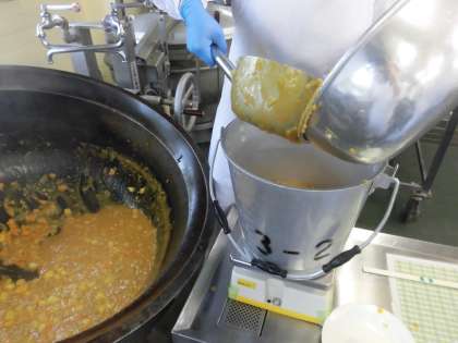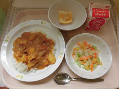 ☆今日は、子ども達の好きな「ポークカレーライス」です。給食室では、鶏ガラからしっかりスープを作り、カレールウも小麦粉 油 カレー粉をじっくり炒めました。玉葱も時間かけて炒めているので、玉葱の甘さも出て美味しく出来ました。