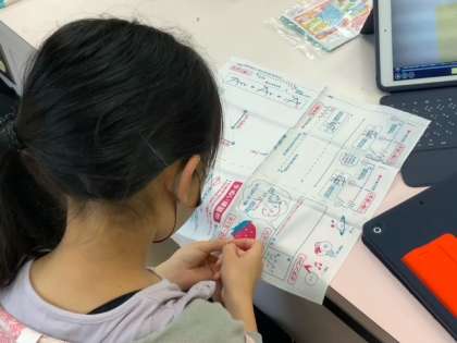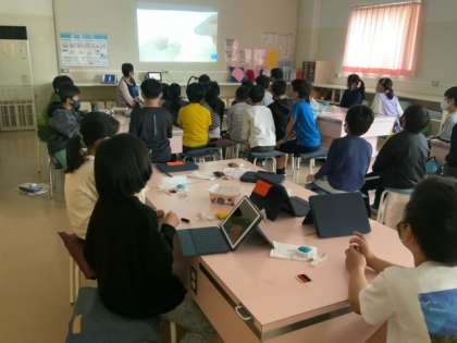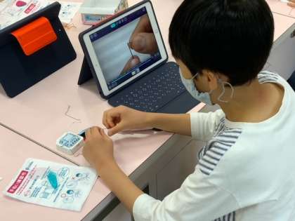 家庭科授業では、裁縫用具の正しい使い方を知り、針と糸で玉結びと玉どめに挑戦です。スクリーンやタブレットの動画で手順を確認して、いよいよ実際に針と糸を使ってイチゴの粒をつくります。