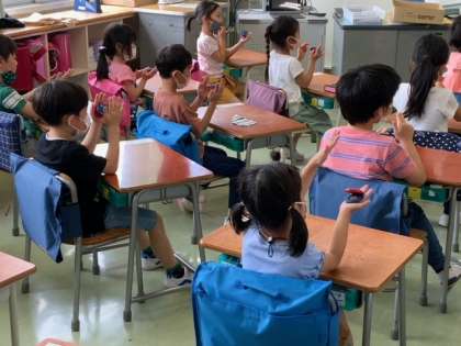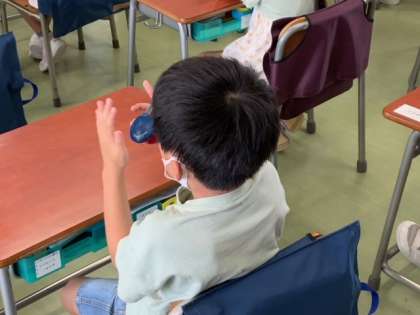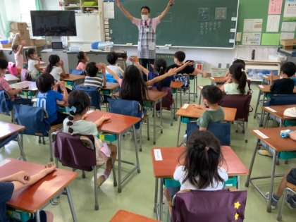 音楽の時間では、カスタネットのいい音の出し方を皆で確認した後、実際に音を出してみています。さっと音を出すことを止めることも大切です。
