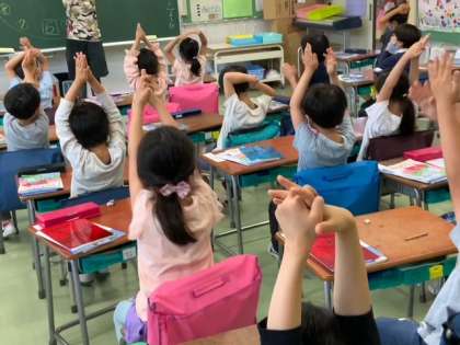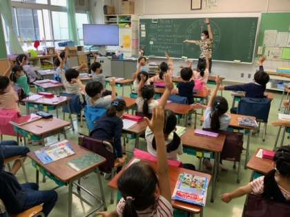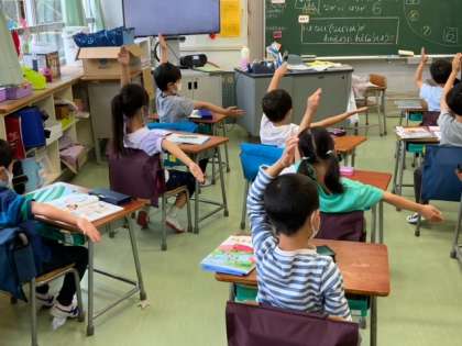 算数で、今が何時になるのかの学習を腕で長針と短針の位置を考えて表現しています。