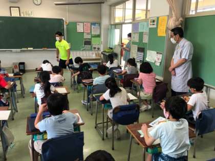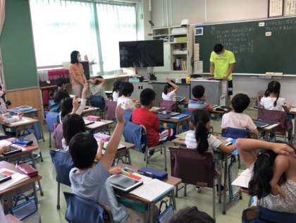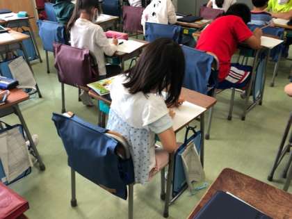 算数では、引き算で求めた答えを足し算で確かめる方法を学んでいます。どんな関係があるのか気付いたことをノートに書いて、タブレット端末で写真を撮り、共有して紹介し合っています。