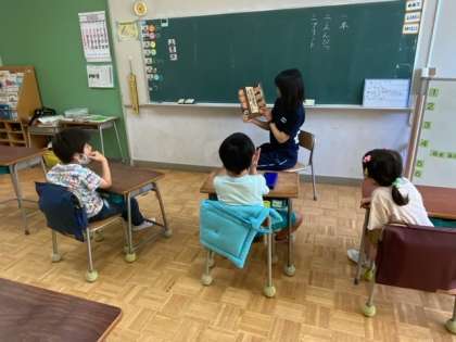 グループに分かれての学習です。読み聞かせや福笑いなどをしています。積極的に取り組んでいます。
