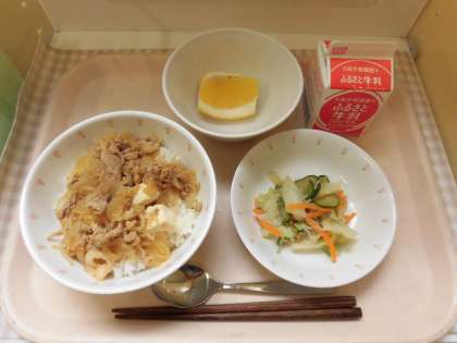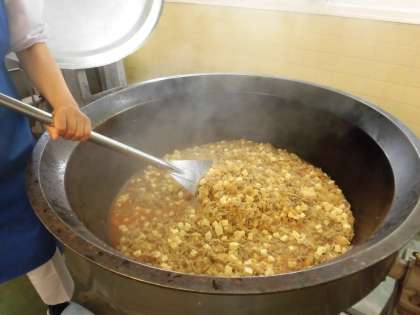 ☆今日は子ども達の人気の「豚丼」です。豚丼には、たくさんの野菜やお肉が入っています。給食室ではたくさんの玉葱を1つ1つ包丁で切り、大釜でじっくりと煮ました。