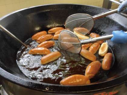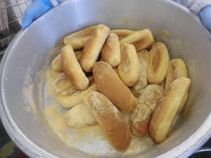 ☆今日は子ども達が大好きな「きなこ揚げパン」です。給食室の大釜でコッペパンを揚げ、きなこと砂糖を合わせたものを、まぶしました。パリパリサラダはワンタンを揚げてサラダにのせています。