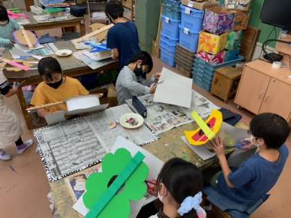 図工で私のギターの仕上げです。上からだけでなく、横から下から見てもいいように、色を塗ったり、ビーズを付けたりしていきます。自分のイメージに合った材料を工夫しています。
