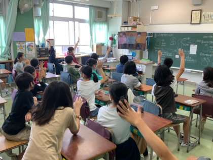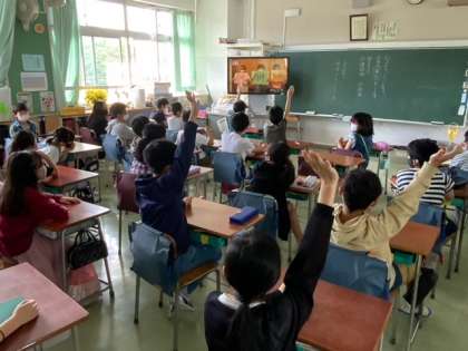 放送での児童集会です。3つのヒントが出されて、どの先生かを当てるクイズです。どの学級でも盛り上がっています。楽しい企画の準備をありがとうございます。