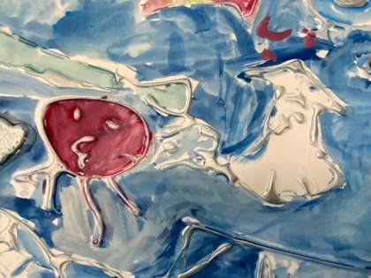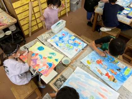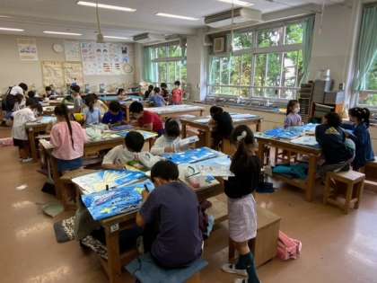 図工室で、海の中・水族館の作品の仕上げをしています。画用紙に木工用ボンドで水の中の生き物などを描き、乾いたところで水彩絵具で色を付けたり、乾いた木工用ボンドの上にペンで色を付けるとメタリック調になります。子どもたちは、変化を楽しみながら作品づくりを進めています。