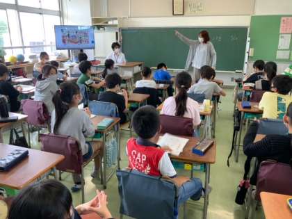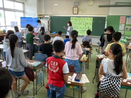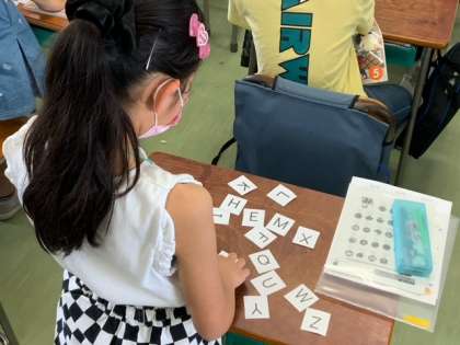 外国語活動の英語で、自分の名前のつづりを聞かれた時の答え方を学んでいます。
