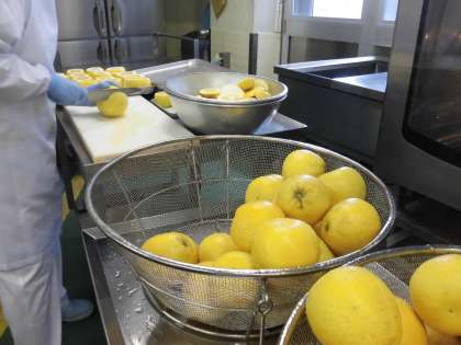 ☆今日の果物は「河内晩柑かわちばんかん」です。初夏から夏にかけて収穫できる黄色くて大きな柑橘です。見た目や大きさはグレープフルーツに似ていますが、グレープフルーツのような苦味は少なく、さっぱりとした甘みのある品種となっています。給食室でも、たくさんの河内晩柑を切りました。