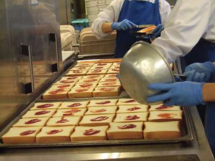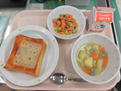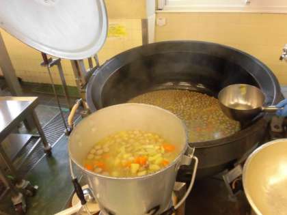 ☆今日の給食は「ポトフ」です。ポトフには、ぶたにく ウィンナー にんじん たまねぎ セロリー きゃべつの野菜を給食室の大釜でじっくり煮込みました。スープの味つけは、塩 こしょうとシンプルに味をつけています。