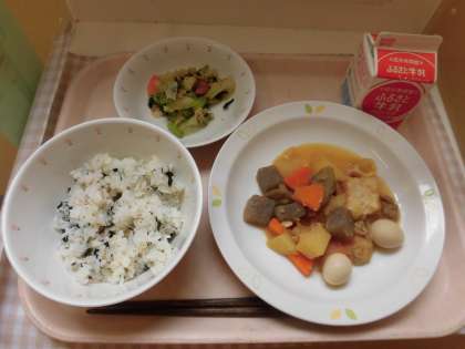 ☆今日の給食は「五目うまに」です。今日は具だくさんの1品です。ぶたにく にんじん 厚あげ じゃがいも たまねぎ ごぼう こんにゃく うずらたまごが入っています。