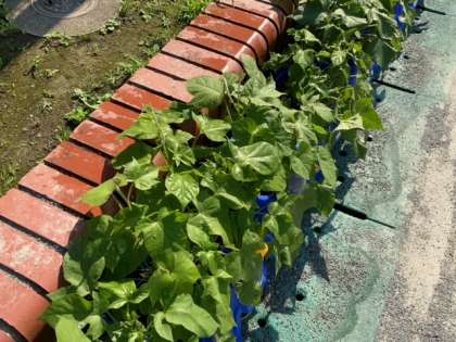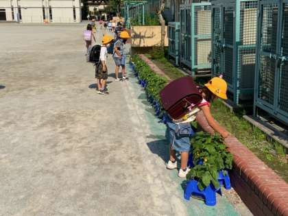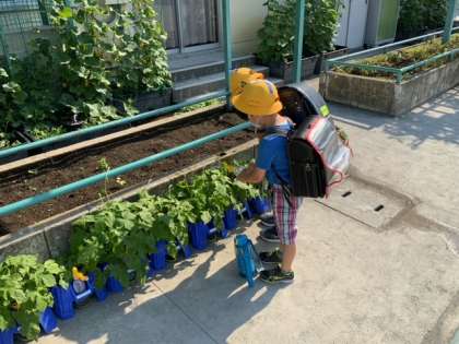 毎朝、1年生が、朝顔の水やりを続けています。ずいぶんと大きくなってきています。男の子が「ジャングルになってきた。」と言っていました。