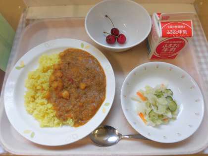 ☆今週は「歯と口の健康週間」です。歯や口の中を健康を見直す一週間となります。今日の献立は「ひよこ豆のキーマーカレー」です。ひよこ豆も固めに茹でて、噛みごたえのあるカレーにしました。