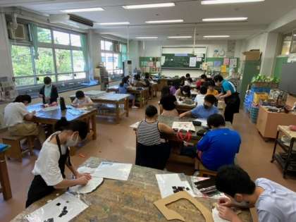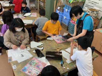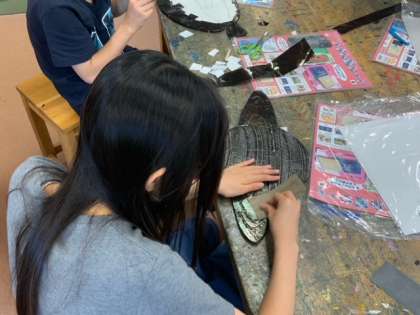 図工でメタリックアートのいよいよ仕上げです。自分の作品に合わせてみがき方をを考えます。