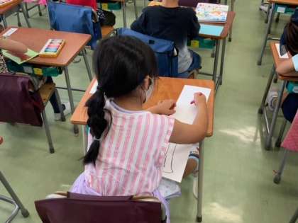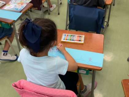 図工で、ながーい紙からどんなものがかけるか、想像力をふくらませて、絵を描いています。