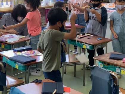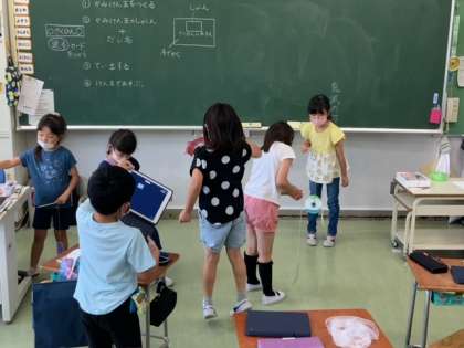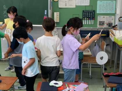 図工で紙けん玉をつくって、実際に遊んでいます。