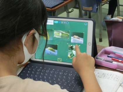 「チョウの育ち方」について、タブレットPCで画像を共有しながら友達と意見交換をしました。