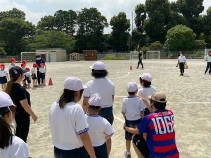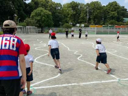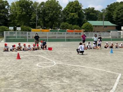 校庭での体育で「書き順リレー」の最終日です。前半は、好きなコースを自分で選び、線に沿ってなるべく速くゴールを目指します。最後は振り向いてスタート地点に向かって手を挙げます。後半は、2チームに分かれてゲームです。上級生が優しく声をかけて走る順番を決めます。負けても勝ってもゲームを楽しめたと振り返りました。