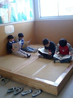子どもたちは、図書の時間が大好きです。烏山小には、図書室のお手伝いの先生が、週に2,3回来て下さいます。今日は、絵本の読み聞かせをしてもらいました。その後は子どもたちが思い思いの本を読む時間です。図書室前の畳スペースは、ゆっくり本を読める、子どもたちお気に入りの場所です。