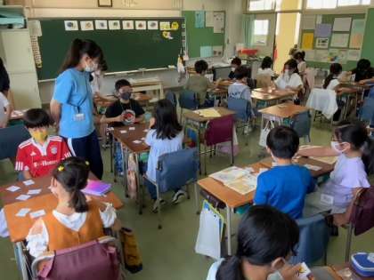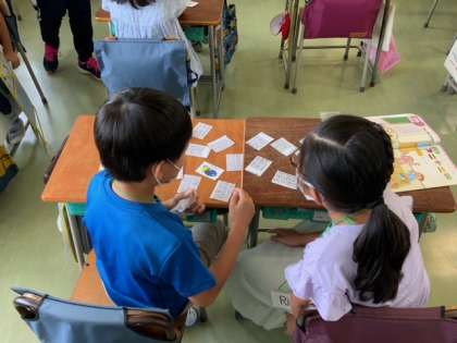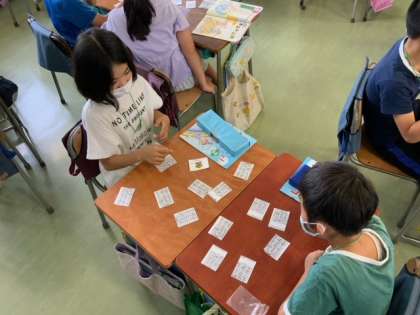 外国語活動で、2人1組になって曜日の神経衰弱をしています。「What day is it?」と言ってからめくることと、めくったカードの曜日を英語で言います。
