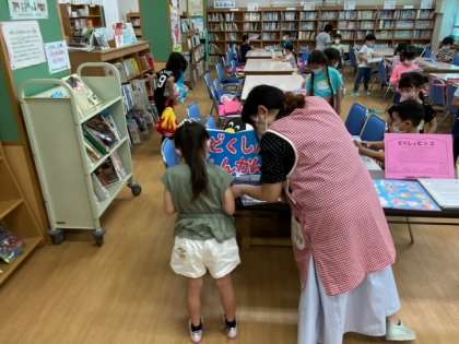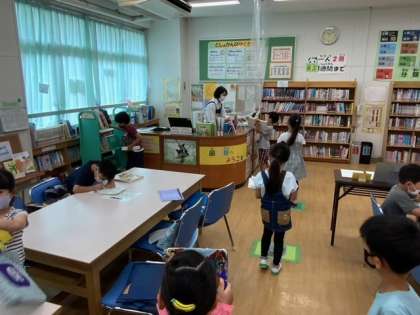 図書の時間です。図書室で気に入った本を借りるために並んでいます。