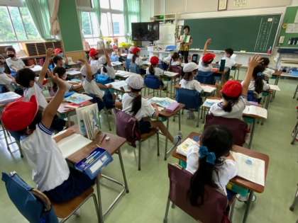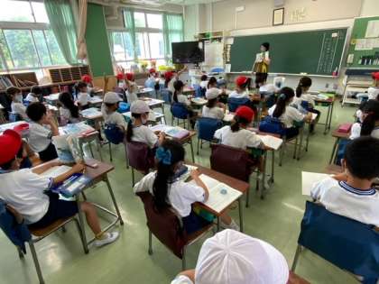 国語で「スイミー」の「 ある日、おそろしいまぐろが、おなかをすかせて、すごいはやさでミサイルみたいにつっこんできた。 」の場面です。「ミサイル」が何かを考えて、「つっこんできた」を実際に演じています。