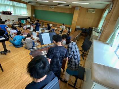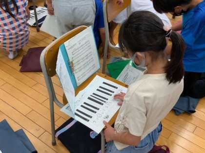 音楽で「小さな約束」をキーボードで音符の長さや指番号にも気をつけて弾きます。まずは、紙の鍵盤を使っての練習です。
