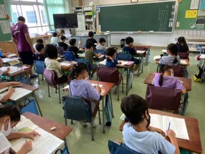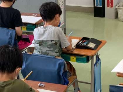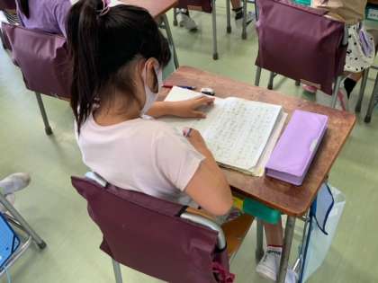 国語のスイミーで、小さな赤い魚たちの気持ちを考えています。まず自分の考えをノートに記しています。