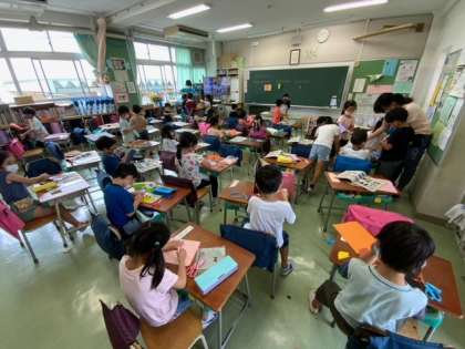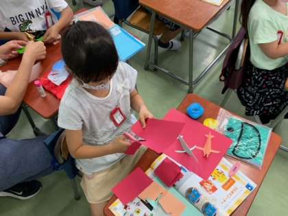 図工の「ひらめきコーナー」で、紙に穴をあけたり、紙を丸めたり、紙を折ったりして思い思いに作品をつくっています。