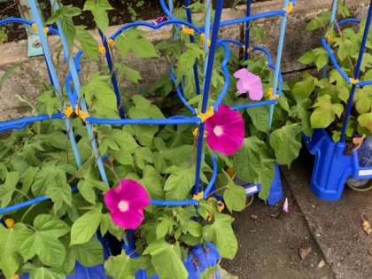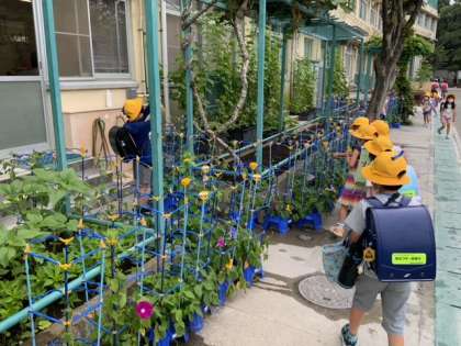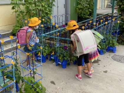 アサガオは、花を咲かせました。1年生も嬉しそうに水やりをしています。きれいな色の花が咲いたと教えてくれました。