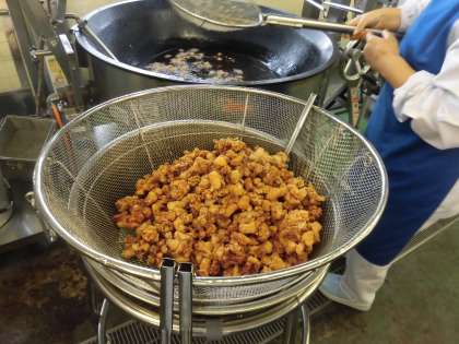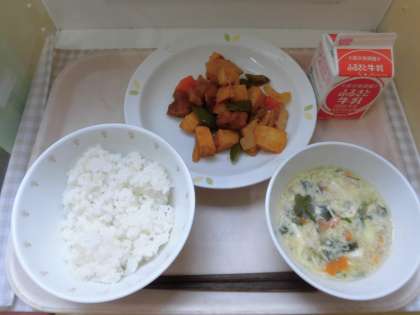 ☆今日の給食は「酢豚」です。角切りの豚肉を使い下味をつけ粉をつけて揚げました。酢豚はたくさんの野菜をとることもでき、また酢を使うので、体をとる働きもあります。給食室の大釜でたくさん作りました。